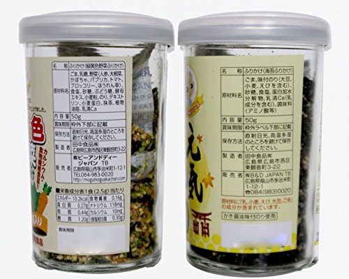 - (緑黄色野菜ふりかけ)原材料:ごま、乳糖、野菜(人参・大根菜・かぼちゃ・パプリカ・トマト・ブロッコリー・ほうれん草)食塩、砂糖、ぶどう糖、のり、デキストリン、小麦蛋白、抹茶、植物油脂、乳清Ca アレルギー物質(27品目中:小麦・乳成分・ごま)