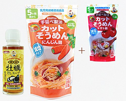 数量限定!お試しセット「牡蠣だしスープ」に[カットそうめん(にんじん)」ご購入でもう1種(トマト)1袋をプレゼント。商品合計1760円が1274円と大変お得です。 5000円以上のご購入で送料無料になります(^^) 安心・安全のお子様の為のだし醤油に届いてすぐに作れるカットそうめんをセットにしたお得なセットです♪昆布より栄養価の高い「根昆布」が入っただし醤油は鉄分入りで、濃い口醤油に比べて塩分を50%抑えた減塩タイプですので、小さなお子様はもちろんご年配の方まで、年齢を問わずご家族皆様で安心してお召し上がりいただけます。 (乳児食品・幼児食品なら、もぐもぐ赤ちゃんへ!B&DJAPAN ,MOGUMOGU,BABY)