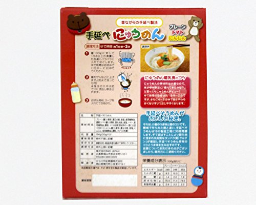 プレーン・トマト麺・にんじん麺の3種入: 手延べそうめんがおいしいのは、機械で作られた麺と違い、16の製造工程に30時間要します。手で延ばすことにより麺生地に含まれる良質なタンパク質「グルテン」が増加し手延べそうめん特有のコシと旨味が生み出されるのです。 にゅうめん離乳食のコツは米粥や野菜に「慣れてきたかな」と思ったらにゅうめんデビュー♪