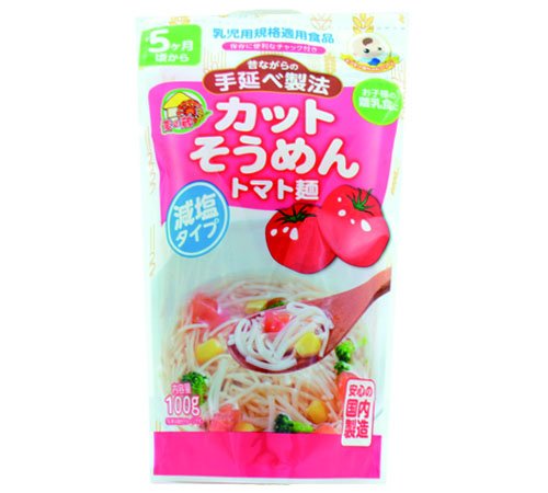 トマトを練りこんだ、トマト麺は約2.5cmにカットされており、お子様の離乳食にぴったり!また、手延べそうめんがおいしいのは、機械で作られた麺と違い、16の製造工程に30時間要します。手で延ばすことにより麺生地に含まれる良質なタンパク質「グルテン」が増加し手延べそうめん特有のコシと旨味が生み出されるのです。 (乳児食品・幼児食品なら、もぐもぐ赤ちゃんへ!B&DJAPAN ,MOGUMOGU,BABY)