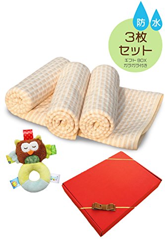 - ★《出産祝いに最適》防水おねしょシーツ 3枚 + ガラガラ を、かわいいギフトBOXに入れてお届けします。実用的な出産祝いとして喜ばれること間違いなし!