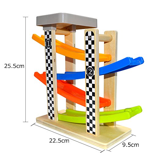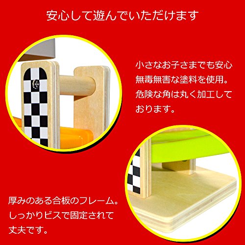 - 主な材質:木材 スロープ:プラスチック / サイズ:本体 25.5×9.5×22.5cm 車 16×3.4×4.3cm / 車の色:①オレンジ ②グリーン ③グレー ④イエロー / 重量600g