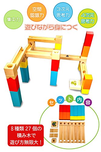 8種類の積み木で立体迷路作り!コースを作ってスタートからゴールへビー玉を転がして遊ぶおもちゃです。遊びながら集中力・空間認識力・三次元思考・四次元思考が身につきます。お子さんだけではなく親子一緒に夢中になれる時間をお楽しみください。ぬくもりのある木のおもちゃはお子様のプレゼントにおススメです。