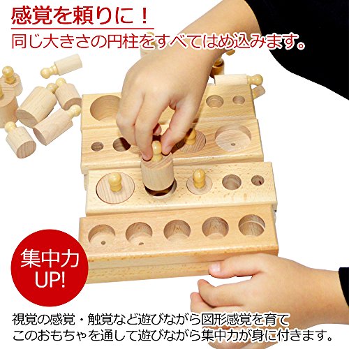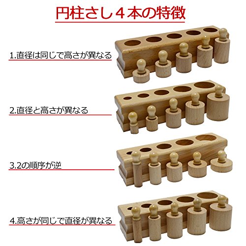 - ★円柱さし4本の特徴。1.直径は同じで高さが異なるもの。2.直径と高さが異なるもの。3.2の順序が逆のもの。4.高さが同じで直径が異なるもの。すべての円柱を取り出します。感覚を頼りに同じ大きさの円柱をすべてはめ込みます。視覚の感覚、目隠しでの触覚など遊びながら図形感覚を育て、創造性を高めます。このおもちゃを通して遊びながら集中力が身に付きます。
