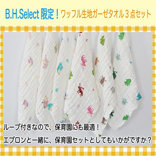 "染み込まない!防水加工のエプロンです。 自分で食べれるようになるのは、嬉しい反面、どうしても気になっちゃうのが、食べこぼし。 B.H. Select の防水エブロンは、EVA樹脂加工を採用しているため、離乳食、汁物、飲み物も何のその。 使用後は、ウェットティッシュでさっと拭きとるか、簡単な水洗いでOK。お手入れも簡単です。 大きめサイズ&しっかり防水加工で、お母さんのお悩みを解決し、毎日の手間を軽減します! 食べこぼしをキャッチ!前ポケット付き。 お食事のときは、前ポケットをひっくり返せば、食べこぼしをしっかりキャッチ! お食事後に、エプロンの汚れが気になる場合は、くるくる巻いてポケットにしまえます。 小さくなるから、持ち運びもらくらく。お出かけにも便利です☆ 肌に優しいワッフル生地の、ガーゼタオル3枚付きのお得セット! B.H. Select 限定、ワッフルガーゼタオルが3枚セットでついてくる! ふわふわ優しい肌触りだから、お子様に安心してご使用していただけます。 6重で吸水力抜群、30×30cmの大判サイズが嬉しい♪ ループ付きなので、保育園にも最適!エプロンと一緒に、保育園セットとしてもいかがですか? デザインは、人気の北欧風柄をご用意しました。 "