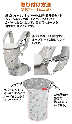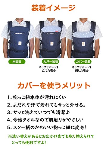 エルゴベビー オムニ専用の フロントカバーです。 クールエアーにも対応 赤ちゃんの汗、オムニなら前向き抱っこ時のよだれでも汚れやすいヘッド&ネックサポート。 抱っこ紐本体は洗濯がしずらく乾きにくいので、頻繁に洗うのは難しいですよね。 そうするとネック&ヘッドサポートには雑菌が繁殖しやすく不衛生。 そこでヘッド&ネックサポーターのカバー(ヘッドカバー/フロントカバー)を使えば、汗やよだれで汚れたときにサッと外して洗うことができ、乾くのも早いので清潔に赤ちゃんを抱っこすることができます。 品質に定評がある今治タオル(日本製)なので吸水性が高く、やさしい肌触りなので赤ちゃんに安心してお使いいただけます。 ★フロントカバーを使うメリット★ 1.抱っこ紐本体が汚れにくい 2.よだれや汗で汚れてもサッと外せる。 3.サッと洗えていつでも清潔♪ 4.今治タオルなので肌触りがやさしい 5.スター柄のかわいい抱っこ紐に変身! ■サイズ アダプト用とオムニ用は形状が同じですが、わずかに大きさが異なります。 お間違えのないようにご注文ください アダプト用:幅約30cm、高さ 約35cm オムニ用:幅約25cm、高さ約35cm ■素材 タオル部分/綿100% パイピンク/ポリエステル65%、綿35% ■生産国:日本(愛媛県今治市) ■お手入れ ・洗濯の際は洗濯ネットをご使用ください。 ・洗剤は中性洗剤を使用してください。