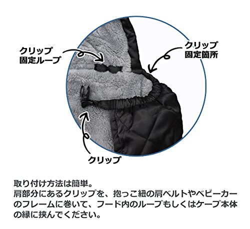 エルゴベビーなどの抱っこ紐(おんぶ/抱っこ)とベビーカーのフットマフとして使える防寒カバーです。 上品なキルティング仕上げなのでいろいろなお出かけシーンでご活用いただけます。 取り付けはクリップで簡単装着。 内側は足をすっぽり包む袋状になっています。 調整ゴムにより赤ちゃんの大きさにあわせてフィットするので寒気の侵入を防ぎます。 赤ちゃんの肌が触れる内側には毛足が長くて肌触りがやさしいボアフリースを採用し、赤ちゃんをやさしく包み込みます。 小物が入るポケット付き。 内側はボアなので、寒さを感じやすい手の甲があったか♪ 暑くなったなと思ったら、外気を取り込んでケープ内の温度調節ができる通気ファスナーがとっても便利!