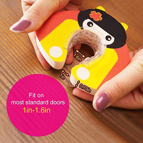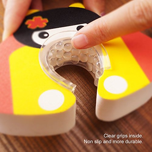 - CUTE BABY SAFETY FINGER PINCH GUARD - U-shaped finger pinch guard (5" X 4" Big, 1" Thick) with transparent non-slip raised textures inside, fasten the guard to the door edge securely. - Inner protection teeth and soft material prevent the door from slamming and accidentally squeezing those tiny fingers. - Leave doors ajar so parents can take a peek of kids, and prevent kids locking themselves in. - Hit the door frame and wall softly when close or open the door without disturbing sleeping kids.