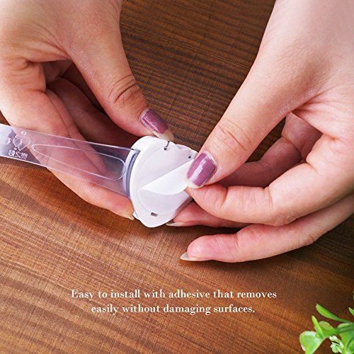 - EASY, EASY, EASY! - Quick installation within seconds; NO tools or drilling - Foolproof latching system keeps even the most determined baby out of trouble while allowing for easy one-handed access for adults - Universal fit: Adjustable strap up to 3.5" and flexible to maximize their use; works on a variety of flat surfaces and round corners including: ceramics, glass, metal and wood - For permanent removal, simply warm the adhesive and peel off without any residue or damage to your furniture.