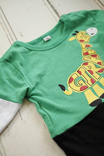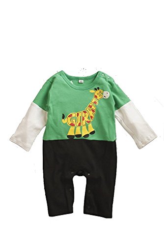 元気なグリーンに、かわいいきりんがプリントされたカバーオール。