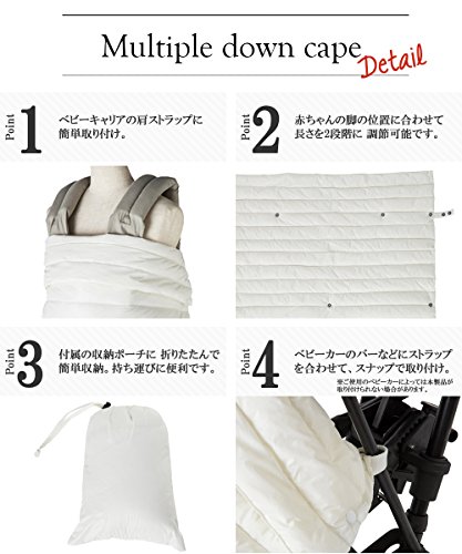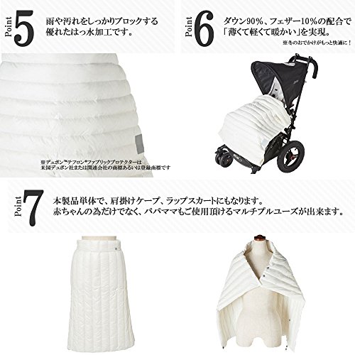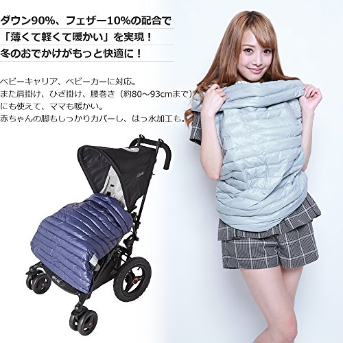 ベビーキャリア、ベビーカーに対応。 また肩掛け、ひざ掛け、腰巻き(約80~93cmまで)にも使えて、ママも暖かい。 赤ちゃんの脚もしっかりカバーし、はっ水加工も。 ● ベビーキャリアの肩ストラップに簡単取り付け。 ● 赤ちゃんの脚の位置に合わせて長さを2段階に 調節可能です。 ● 付属の収納ポーチに 折りたたんで簡単収納。 持ち運びに便利です。 ● ベビーカーのバーなどにストラップを合わせて、スナップで取り付け。 ※ご使用のベビーカーによっては本製品が取り付けられない場合があります。 ● 雨や汚れをしっかりブロックする優れたはっ水加工です。 風合いや通気性はそのままに、快適にご使用いただけます。 ※デュポン テフロン ファブリックプロテクターは米国デュポン社または関連会社の商標あるいは登録商標です。 ● ダウン90%、フェザー10%の配合で「薄くて軽くて暖かい」を実現。 冬のおでかけがもっと快適に! ● 本製品単体で、肩掛けケープ、ラップスカートにもなります。 赤ちゃんの為だけでなく、パパママもご使用頂けるマルチプルユーズが出来ます。 【サイズ】 W95×D1×H70cm ※パッケージサイズ W17×D10×H26 cm 【重 量】 100g 【原産国】 中国 【材 質】 表地・裏地:ナイロン100%中わた:ダウン90%、フェザー10%