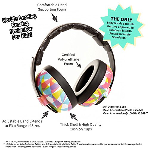 Banzから、可愛くて機能的な、子供用ヘッドフォンが登場 ・子どもの耳は大人よりもとっても敏感、大切なお子様の耳を大きな音からしっかり守りましょう! ・85デシベル以上の音量に8時間以上さらされる場合、耳の保護が必要と言われています。 ・映画館やコンサート、スポーツ観戦など大音量が気になる時の必須アイテム ・聴覚過敏のお子様にもオススメ ・耳あての部分はソフトなクッション素材で、耳周りをぴったり覆い、遮音性もアップしています。 ※ベビー用は締め付け感がソフトにできています ※耳に入る音を31デシベル減少 ※平均減衰値:500Hz、25.7dB ※平均減衰値:1000Hz、35.2dB ※米国規格協会の定める防音器具の基準に適合。 ※欧州の統一規格であるEN規格の定める防音器具・防護衣類等の基準に適合。