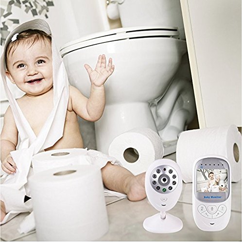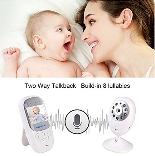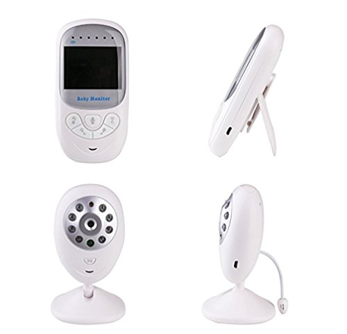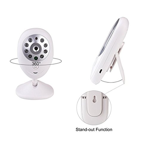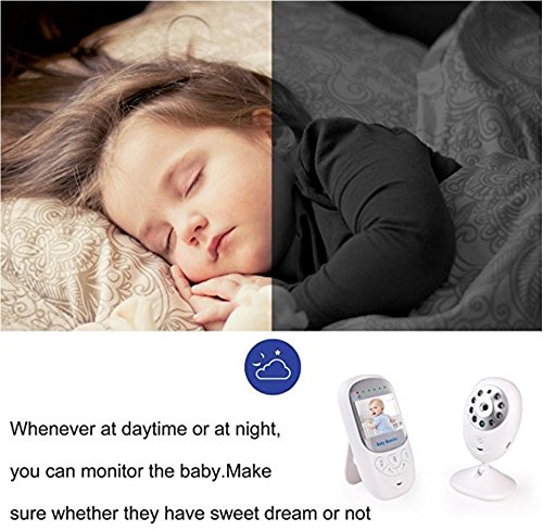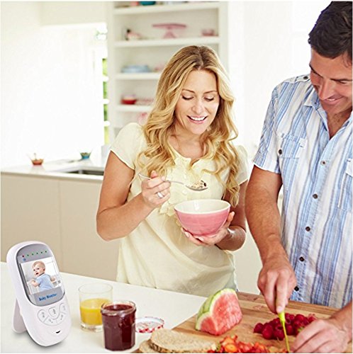 1 Easy to set up, plug and play, pair automatically. 2 Two-way audio, live camera, automatic night vision. 3 Crying Warning Light based on sound. 4 Room temperature monitor, ℃/℉ switch. 5 Long range wireless connection: outdoor 960ft(no obstacle), indoor 180ft to 220ft. 6 Longer Battery ensures longer care. 7 HD 2.4 inch screen, 2X zoom in to see more, brightness adjustable. 8 Eight soft lullabies to soothe baby. 9 Soft Light to protect baby's eyes. 10 Larger buttons for easier operation. 11 For easier setup and use: 71inch/1.8m cable, 360 degree adjustable camera, wall mount, bracket and clip. Specification Color: White Power Supply: Input 100-240V, 50/60Hz. Output 5V/1A. Screen: 2.4 inch HD 640*480. DC Image Sensor: CMOS. Night Vision Distance: 27ft/8m. Full Charge Time: 4 hours Controller Battery: Li-polymer, 600mAh. (works for 5.5 hours if screen keeps on, but up to 8 hours if turn off screen when not in use). Note This baby monitor is not a substitute for responsible adult supervision. Read the user's guide before using the baby monitor. Avoid shielding to get a better signal. Keep the baby unit and cable out of reach of children. Overcharge may cause battery death, do not keep monitor charging all the time. Package Includes 1 x Parent Unit (Controller) 1 x Baby Unit (Camera) 2 x Chargers 1 x Manual