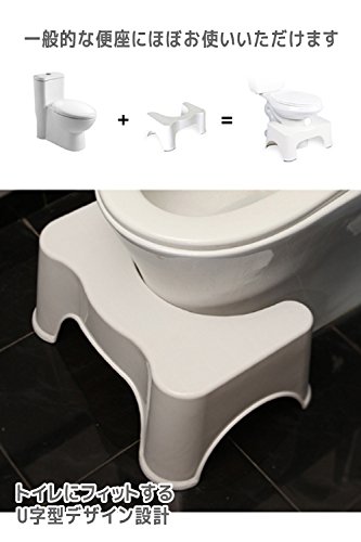 洋式便器に設置するだけで、排便がベストな体制になるトイレ踏み台。膝が腰よりも高い位置になり前傾姿勢になる事で自然に排便しやすくなります。便秘解消に、お子様のトイレトレーニングに最適です。水に濡れても乾きやすくお手入れしやすい素材なのでいつも清潔にお使い頂けます。便座のカーブにそったU字ラインでピッタリフィットします。