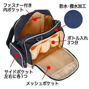 このマザーズバッグは、トートバッグにもショルダーバッグにもリュックにもなる3WAY大容量マザーズバッグ。両サイドにはポケットが2つ。1つはさっと取り出せて便利なティッシュ箱やお尻拭きシート入れ。マザーズバッグの底面には防水,撥水加工のスペース付きで靴や折りたたみ傘を入れるのに最適です。※マザーズバッグは、写真撮影をしている関係上、実物商品との色あいが、若干の違いがありますこと、ご了承ください。 ※予告なく仕様及びプレゼント商品が変更なる場合がございます。悪しからずご了承ください。