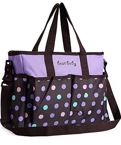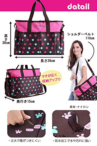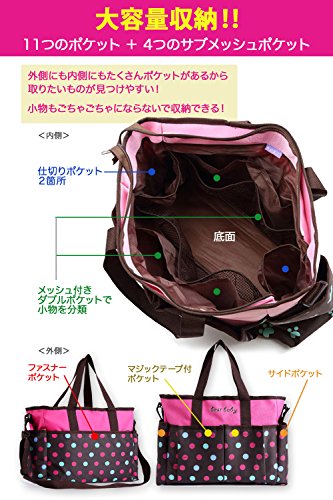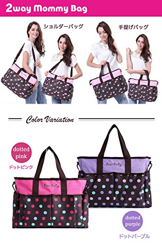 ドット柄が可愛いマザーズバッグ。撥水性のあるナイロン製の生地なので軽くて丈夫。また底板が入っているので型崩れしにくく荷物も入れやすいです。ポケットがたくさんついており入れたものが確認しやすくとても便利。ごちゃごちゃしないで整理整頓できます。2WAY仕様で手提げもショルダー掛けもできます。またベビーカーに固定するベルトも付属しており様々なシーンでお使いいただけます。オムツ代えのマットが付属しています、使わないときはたたんで収納できすっきり。色はパープルとピンクの2色からお選びいただけます。サイズ:長さ36cm、高さ30cm、マチ15cm、ショルダーベルト110cm
