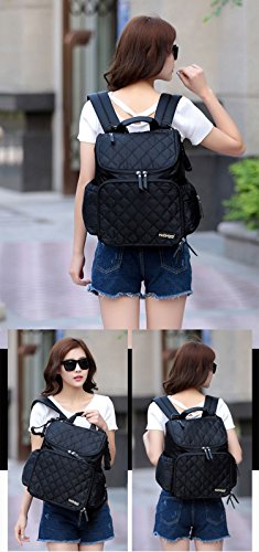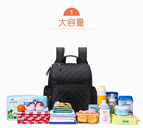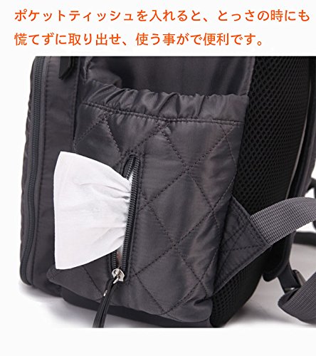 おむつ替えシート(56cm×30cm)両側にはティッシュ専用ポケットと水筒入れポケット、後ろには盗難防止ポケット、メインポケットという四部分。メインポケットには複数のしきりが備わって、ベビー用品(着替え、哺乳瓶、水筒、オムツ、粉ミルク、タオル)、あるいは通勤用品(お化粧ポーチ、お財布、スマホ、鍵、ipad、A4ファイル、ノートパソコンまで)収納できます。