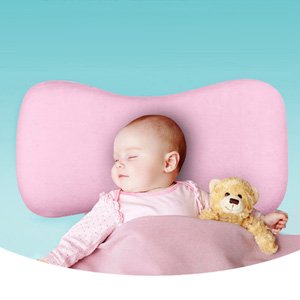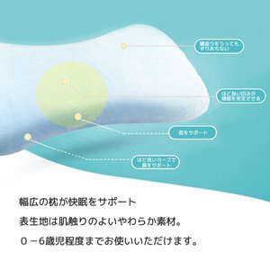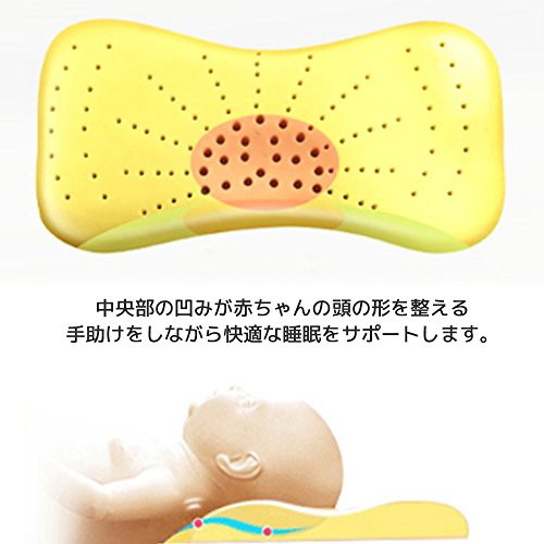 - 赤ちゃんのやわらかな頭部を支える形状のベビー枕。中央部分のくぼみ形状が頭の形を良くする手助けをします。