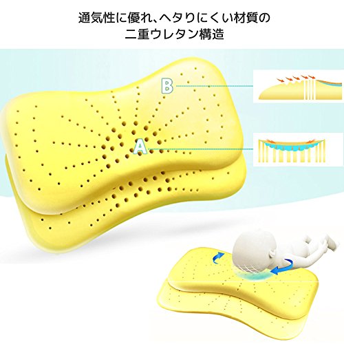 赤ちゃんのやわらかな頭を支える中央部分のくぼみ形状が、頭のかたちを良くするお手伝いをします。中身は大きな穴が空いたウレタン製で通気性に優れていて熱や湿気がこもりにくく、蒸れにくい。ホコリも出にくく清潔な素材です。肌に当たる表地(カバー)はぱパイル素材でやさしい肌触りです。