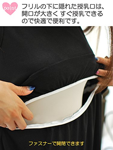 授乳口付のノースリーブワンピースです。産前、産後だけでなくやわらかい素材でゆったりとした作りですので肌が敏感になりやすい妊娠期にも使えます。 どんな方にも似合うスタンダードな丸首襟。 <便利な隠し授乳口> 上半身のフリルの下に隠し授乳口があります。 チャックで開閉できるので授乳の際も便利です。 <スタイルアップ効果> ウエスト上にあしらったフリルはファッション性に優れているだけでなく気になるウェスト周りもカバーしてくれます。 またウエストの高い位置にフリルがあることで足を長く見せる効果もありスタイル良く見せてくれます。 立体的に裁断していており女性の身体がきれいに見えるようなデザインを追求しています。 シンプルデザインのノースリーブですので普段使いに便利です。夏はそのままさらりと着ていただけます、春秋は羽織ものをプラスして。ルームウェアとしてもお使いいただけます。