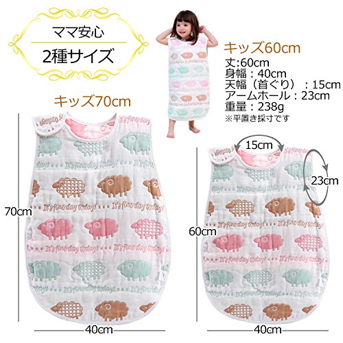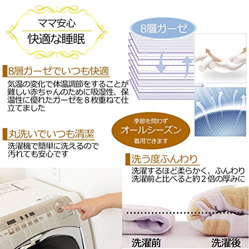 8枚のガーゼを重ねたとてもふわふわの8重ガーゼスリーパー。素材は安心安全な100%天然オーガニックコットンです。夏は涼しく、冬は暖かい万能の通気性と保湿性があります。冬にはお子様の寝冷え、夏には寝苦しい夜の汗などをしっかりカバーし、お子様にとって気持ちいい環境を作り、風邪なども心配ありません。【丸洗い洗濯可能】洗濯機で丸洗い可能なため、よだれや食べこぼし、そのほか汚れなども気にせず常に清潔に保ちます。また洗うたびにガーゼがふわふわで気持ちよくなります。【脱げにくい】動きまわるお子様はそれだけで大変。ガーゼスリーパーはサイドにボタンがついているので、動き回ったり寝ている際に脱げたりせず安心です。【対象】0歳の新生児から7歳ごろの幼児まで幅広く長くお使いいただけます。 【サイズ】ベビーサイズ:長さ60cm×幅40cm キッズサイズ:長さ70cm×幅40cm
