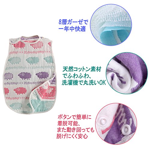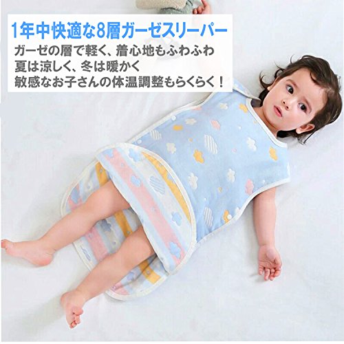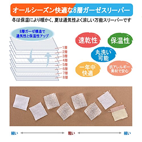 8枚のガーゼを重ねたとてもふわふわの8重ガーゼスリーパー。素材は安心安全な100%天然オーガニックコットンです。夏は涼しく、冬は暖かい万能の通気性と保湿性があります。冬にはお子様の寝冷え、夏には寝苦しい夜の汗などをしっかりカバーし、お子様にとって気持ちいい環境を作り、風邪なども心配ありません。【丸洗い洗濯可能】洗濯機で丸洗い可能なため、よだれや食べこぼし、そのほか汚れなども気にせず常に清潔に保ちます。また洗うたびにガーゼがふわふわで気持ちよくなります。【脱げにくい】動きまわるお子様はそれだけで大変。ガーゼスリーパーはサイドにボタンがついているので、動き回ったり寝ている際に脱げたりせず安心です。【対象】0歳の新生児から7歳ごろの幼児まで幅広く長くお使いいただけます。 【サイズ】ベビーサイズ:長さ60cm×幅40cm キッズサイズ:長さ70cm×幅40cm
