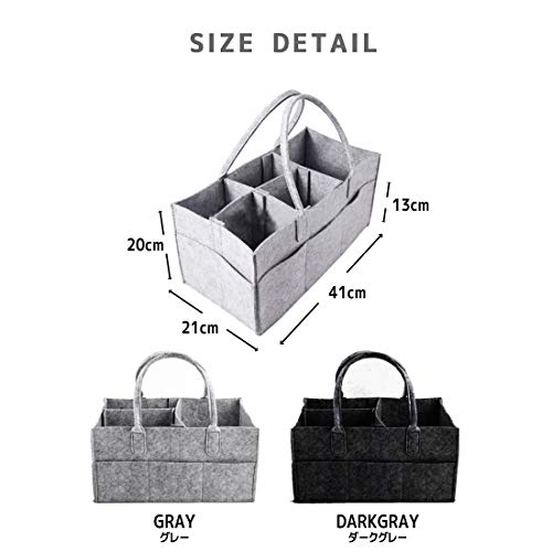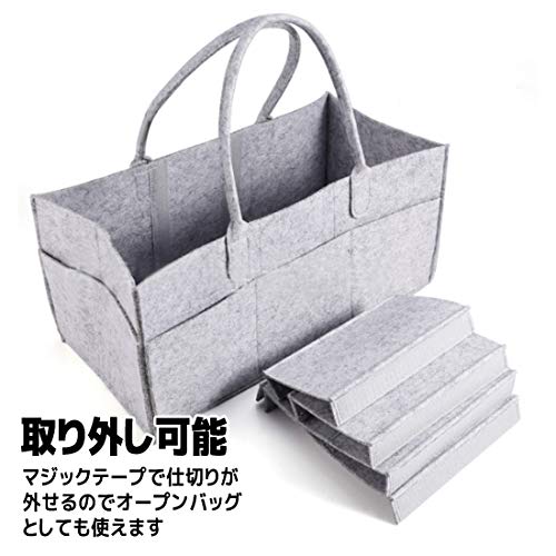 おむつ替えに必要な小物が全て収まる大容量収納バッグ。使いやすい5つのスペースに分割できます。とても軽く、車でのお出かけや、ご家庭での使用にも最適です。マジックテープで仕切りをアレンジ可能なので、ご自分の使い方や、持っていく荷物に合わせて自由に変更できます。全て取り外せばオープンバッグとしても便利です。サイズ(約):41×20×21cm 素材:フェルト