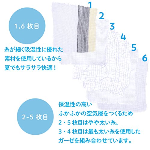 - 【吸湿性・保湿性にすぐれ、夏はさらさら、冬はポカポカ!】1枚目と6枚目は直接に肌に触れるため、糸が細く吸湿性に優れた素材を使用しています。そのため、夏でもサラサラ快適です。ふかふかの空気層を形成させるため2・5枚目はやや太い糸、3・4枚目は最も太い糸を使用したガーゼを組み合わせています。