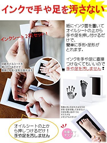 インクシート2枚セット☆失敗しても安心☆ ◎先輩ママおすすめ!世界に立ったひとつだけ!手形、足形メモリアルスタンド。◎写真と共に生まれたばかりの手形,足形を残しておきたい!素敵な想い出になります。◎手や足を汚さない衛生的なオイルシートで簡単・手や足を汚さずに手形、足形が取れます。インクシートに手をのせて、そっと紙に押すだけで細かいしわまで再現してくれます☆ ◎インクシートは水性インクを使用、黒い色は炭を使用して安心安全! ◎ホワイトのウッドフレームでとっても可愛い☆ ◎台紙は12枚ついています。 成長毎に残して手形足形を残しておくのもおススメです! ◎今しかない可愛い手や足を記念に一生の思い出に☆ 手や足に直接インクをつけずに手形足形をとることができます!! 衛生的で手軽、簡単にメモリーを残せます。