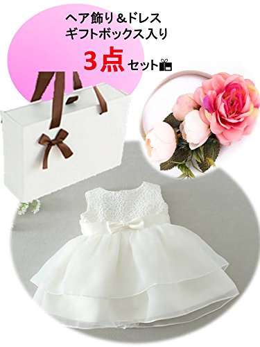 ベビードレス 女の子 3点セット 結婚式 ギフト用 白 ヘアアクセサリー付き 発表会 七五三 セレモニー用 (24m)