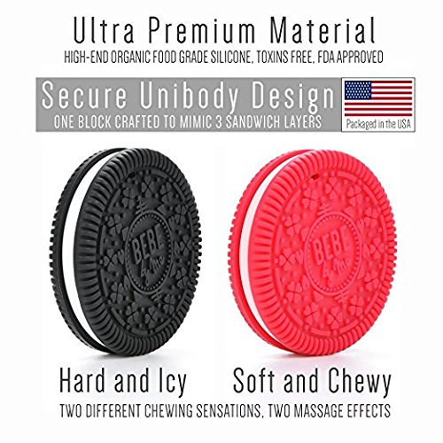Trademark protected and Patent pending. One HARD + one SOFT for 2 chewing sensations Unique gum massaging features: Each flower or ridge has a different soothing effect (100% Exclusive) Luxury medical grade silicone of highest Japanese standards - Antimicrobial, 100% free from Pthalates, Latex, Lead, Cadmium, PVC, BPA Stimulates visual, motor, sensory development