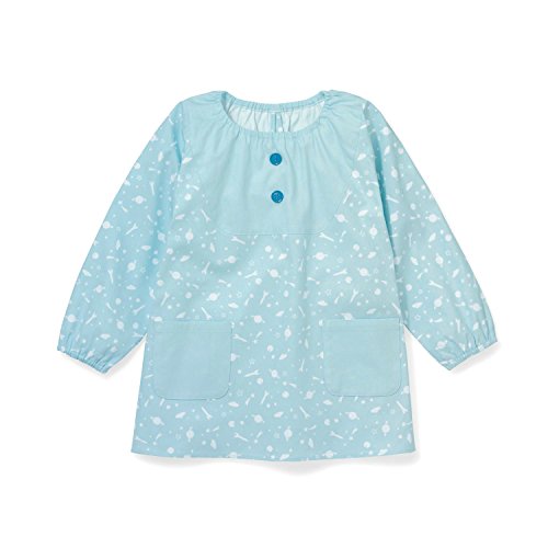 綿素材で爽やかな着心地。ひとりで脱ぎ着カンタン! 可愛いカラーにボタンとポケットがアクセント。襟ぐりゴムでかぶりやすく、背中の開きでムレも軽減してくれるスモックです。ゆったりめの作りで長く使えます。 【ママさんのお声!モニター隊が試着してみました!】 お子様の身長89cm/試着サイズ:90~100/年齢2歳10か月/女児 パット見は大きめかなと思ったのですが、実際着てみるとほどよく余裕があってちょうどよいです。キレイなブルーで男女ともに着れます。頭からすっぽりとかぶるだけなので、2歳の娘でも一人で簡単に着脱できました。粘土など、遊びの時だけでなく、ママのお手伝いや洋服を汚したくないときには必須アイテムになりそうです。