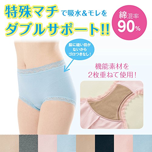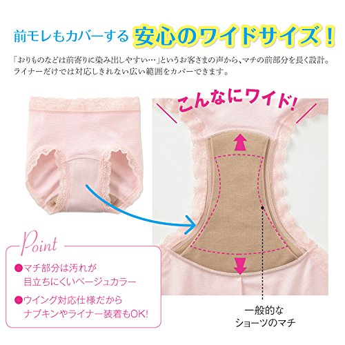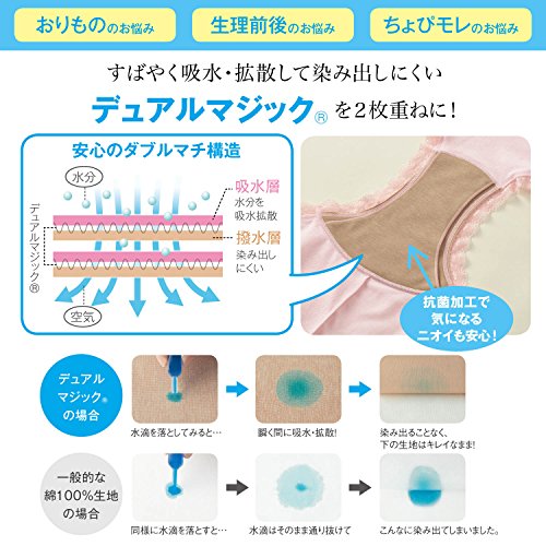 大人のドキッ!をまるごとケアするエチケットショーツ おりものや生理前後の少量血、出産後の“ちょぴモレ”などにドキッ!とすること、ありませんか?このショーツのヒミツは、クロッチ部分の特殊マチ。機能素材「デュアルマジック(R)」を2枚重ねて使用し、肌側は吸水層でサッと吸水・拡散。裏側は撥水層でアウターへの染み出しをガードしてくれます。前までカバーできるワイドサイズのクロッチだから、ライナーだけでは対応しきれない広い範囲をカバーできます。身生地は、綿混率90%で柔らかく、肌にやさしくフィット。イヤな締めつけやくいこみを軽減した設計で、一日中快適。デイリーショーツとしてはもちろん、サニタリーショーツとしても使えます。