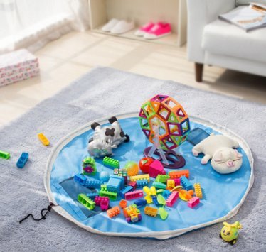 - 遊ぶときは広げてプレイマットとして大活躍。 ヒモを引っ張るだけでお片づけ! おもちゃ遊びスペースが一気に収納袋に。