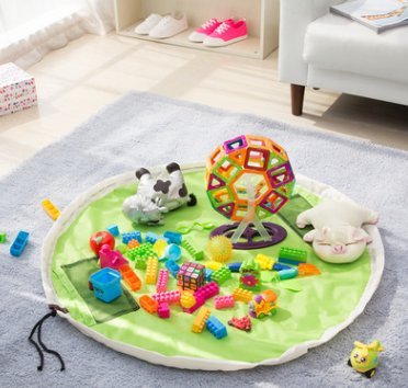 - 遊ぶときは広げてプレイマットとして大活躍。 ヒモを引っ張るだけでお片づけ! おもちゃ遊びスペースが一気に収納袋に。
