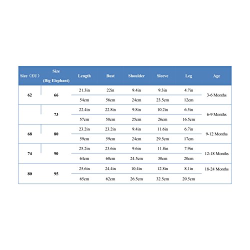 - サイズ:3-6 ヶ月,6-9 ヶ月, 9-12 ヶ月, 12-18ヶ月, 18-24ヶ月。 3-12ヶ月足付きカバーオール。