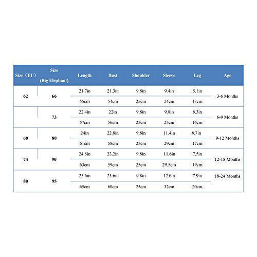 - サイズ:3-6 ヶ月,6-9 ヶ月, 9-12 ヶ月, 12-18ヶ月, 18-24ヶ月。 3-12ヶ月足付きカバーオール。