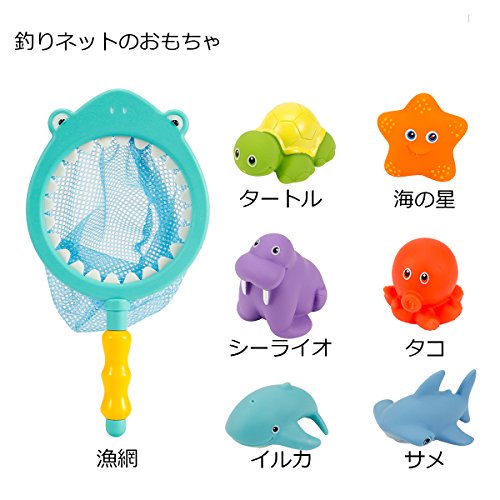 - 【パッケージ内容】釣りゲームおもちゃ(魚×2、カニ×1、怪物×1、釣り竿×1)、釣りネットのおもちゃ(タートル、シーライオン、タコ、海の星、サメ、イルカ、漁網)