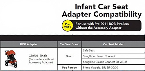 For use with older BOB Single Strollers that do NOT have the accessory adapter feature (manufacture dates of 2005-2010). NOT compatible with BOB Single Strollers with a manufacture date of 2011 and newer.;Compatible with older infant car seats: Graco Snug Ride Classic Connect; and Peg Perego Primo Viaggio, SIP and SIP 30/30. NOT compatible with newer models: Graco Snug Ride Click Connect; Peg Perego Primo Viaggio 4.35; and Britax or Chicco seats.;Semi-permanent installation for safety and durability that folds with the stroller.;Includes a snack tray for toddler years.