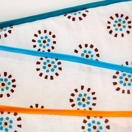 ポコポコした感触が楽しい発砲プリントはゴールドの刺繍がアクセントに。サテン生地に配色パイピングをあしらい、鮮やかな色を効かせています。