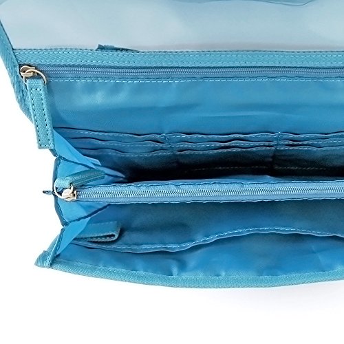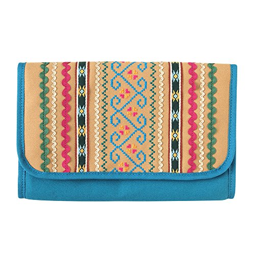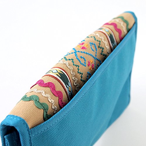 刺しゅうやテープをふんだんに使った鮮やかなフォークロア調の母子手帳ケースです。Lサイズの母子手帳まで入ります。ジャバラ式なので、赤ちゃんを抱っこしているときや荷物の多いときにも楽に扱えます。外側にポケットが1つ、内側に写真などが入るビニールポケットが1つ、カードポケットが9つ、ファスナー付きポケットが1つ、ペンホルダーが2つ、仕切りポケットが1つ付いています。表生地には撥水加工が施してあります。