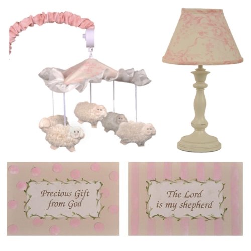 Decor kit inlcudes wall art, musical mobile, and lamp;Made from cotton, poly resin, poly fill, foam board;Dust or spot clean only