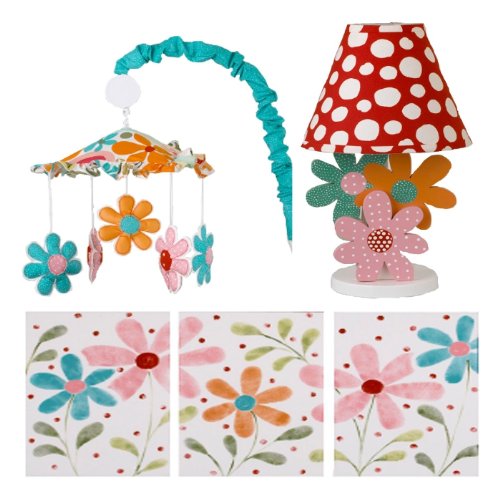 Decor kit inlcudes wall art, musical mobile, and lamp;Made from cotton, poly resin, poly fill, foam board;Dust or spot clean only