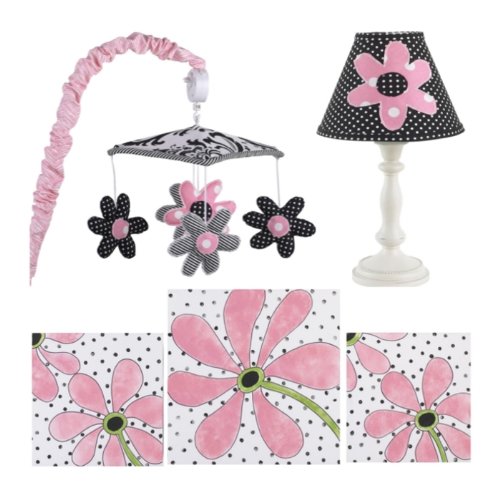 decor kit inlcudes wall art, musical mobile, and lamp;Made from cotton, poly resin, poly fill, foam board;Dust or spot clean only