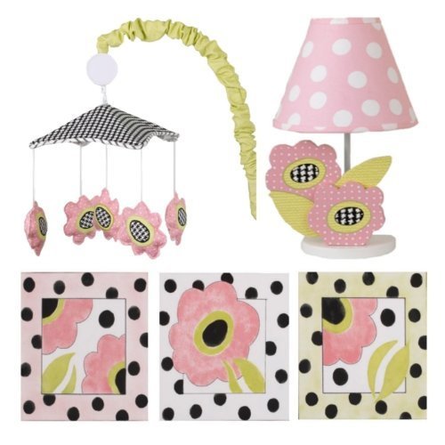 d閏or kit inlcudes wall art, musical mobile, and lamp, Made from cotton, poly resin, poly fill, foam board, Dust or spot clean only