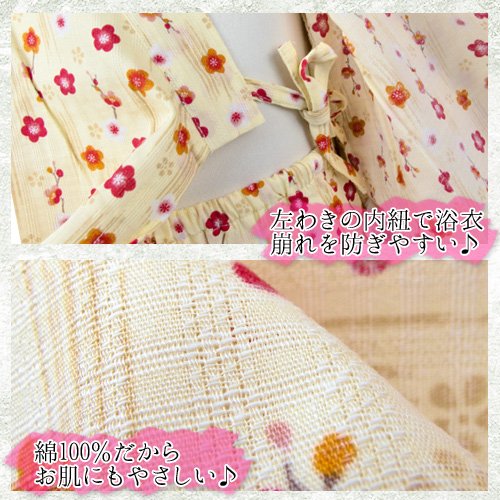 夏の季節にはかかせない梅柄プリント入りのセパレート浴衣です 上と下が別々になっているのでお着替えもラクラク☆ 左わきについた内紐で、浴衣崩れもを防ぎやすい ※帯は別売りとなっております。 ヘコ帯などの帯が必要な場合は、他の販売店などでお買い求め下さい。 サイズ: 90/95 カラー: ピンク系/アイボリー系 素材: 綿 100% 原産国: 中国