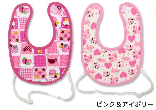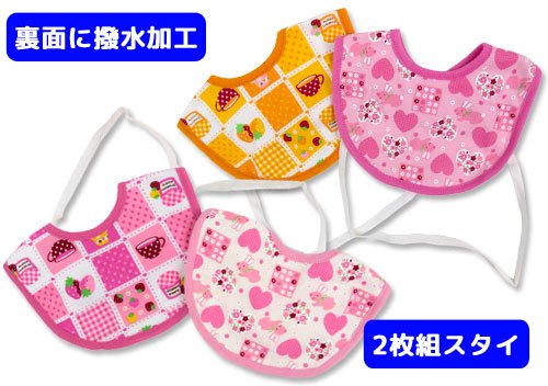とってもかわいい女の子向けスタイ2枚セットです 後ろマジックテープで簡単着用できます。 スタイは何枚あっても重宝しちゃいます ちょっとしたプレゼントにもいいですね 裏面に撥水加工入り。 イチゴやティーカップなどの総柄プリントとハートとウサギさん総柄2枚セットなのが嬉しい☆ お色はピンク&アイボリーセットとオレンジ&ピンクセットの2色展開です サイズ: F(フリーサイズ) カラー: ピンク&アイボリーセット/オレンジ&ピンクセット 素材: 表地 ポリエステル65% 綿35% 裏地 ポリエステル 100% 原産国: 中国