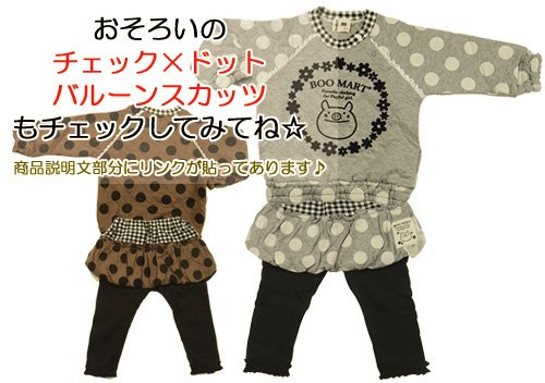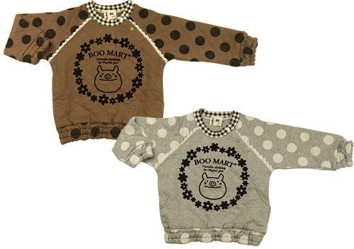 超人気ブーマートのニットキルト ドットトレーナー お花柄で囲まれたかわいいBoo☆ さらにみんな大好きドット柄 首まわりはチェック☆さらにレースも使って超CUTEだね(*^m^*) 色はブラウンとグレーの2色展開 左肩にホックもついていて脱ぎ着もさせやすいしGOOOODなトレーナーです☆ おそろい☆チェック×ドットスカッツ (←クリックしてね☆)もご検討下さい(*^o^*) サイズ: 80/90/95 カラー: ブラウン/グレー 素材: 本体・表側、裏側:綿100% 中わた:ポリエステル100% リブ部分・綿95%、ポリウレタン5% 原産国: 中国