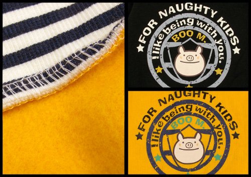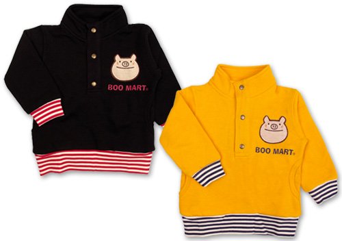 超人気ブーマートのBOOプリント裏起毛トレーナーです お肌に触れる面はふわふわの起毛でベビーちゃんもあったか☆ 正面のスナップボタンで着脱ラクラク☆ 前身ごろはにっこりBOOのフェイスアップリケとロゴプリント入り お腹横にはポッケがついています 後には大きく入った英語プリントがかっこいい☆ リブのボーダーもアクセントになってるね☆ お色はブラックとカラシの2色展開 サイズ: 80cm/90cm/95cm カラー: ブラック/カラシ 素材: 本体・綿100% リブ・綿95% ポリウレタン5% 原産国: 中国