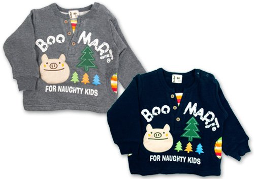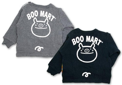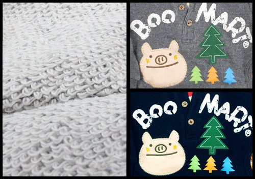 超人気ブーマートのお胸のBOOアップリケが可愛い重ね着風トレーナー 毛足が比較的寝ているので裏毛特有の凹凸は控え目で、トレーナーによく使用されるガーゼ裏毛使用 胸元からちらっと見える重ね着風のラインもかわいいね☆ 後はブーのお顔がおっきくプリントと ロゴ入り 色は杢グレーとネイビーの2色展開です サイズ: 80/90/95 カラー: 杢グレー/ネイビー 素材: 本体・綿100% リブ・綿95% ポリウレタン5% 原産国: 中国